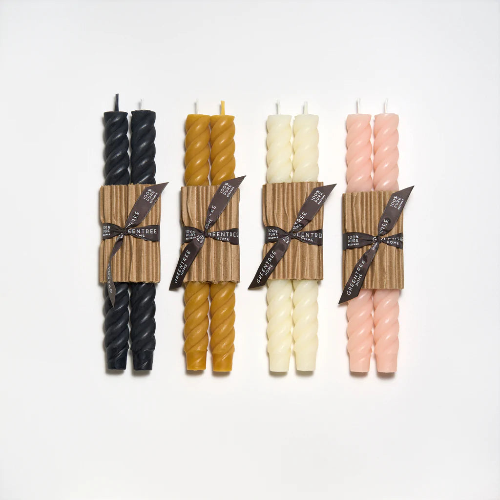 The unique shape adds graceful style to the home. When lit the tapers burn clean and bright. Each candle is hand poured and made from 100% pure North American beeswax. Tapers are sold in pairs.