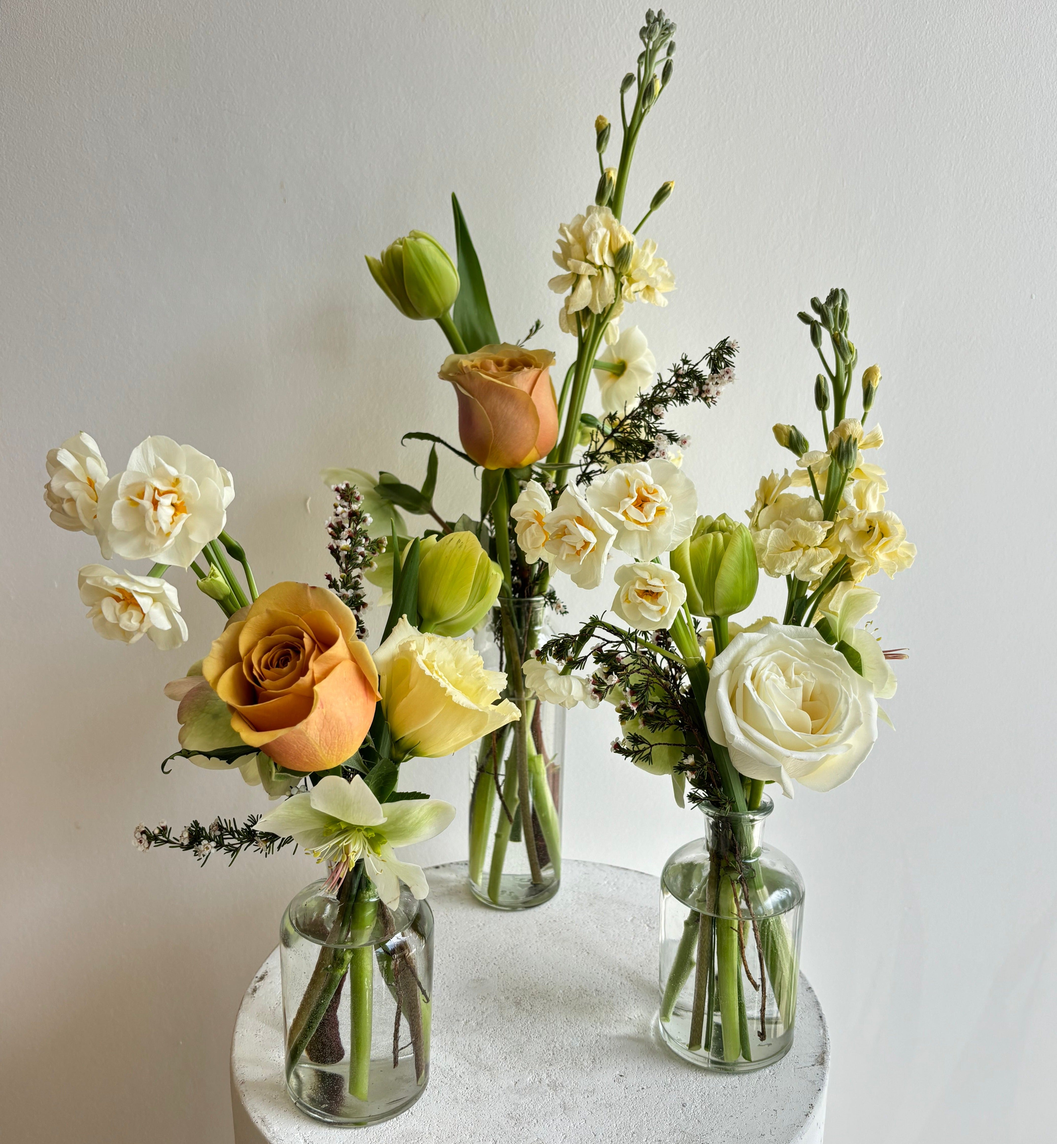 Enhance your space with a touch of flowers by using our Bud Vase Trio. This set comes with 3 clear glass bud vases (2 short, 1 tall) and 4-5 blooms in each. Customize your desired colour scheme and leave special requests in the notes section.