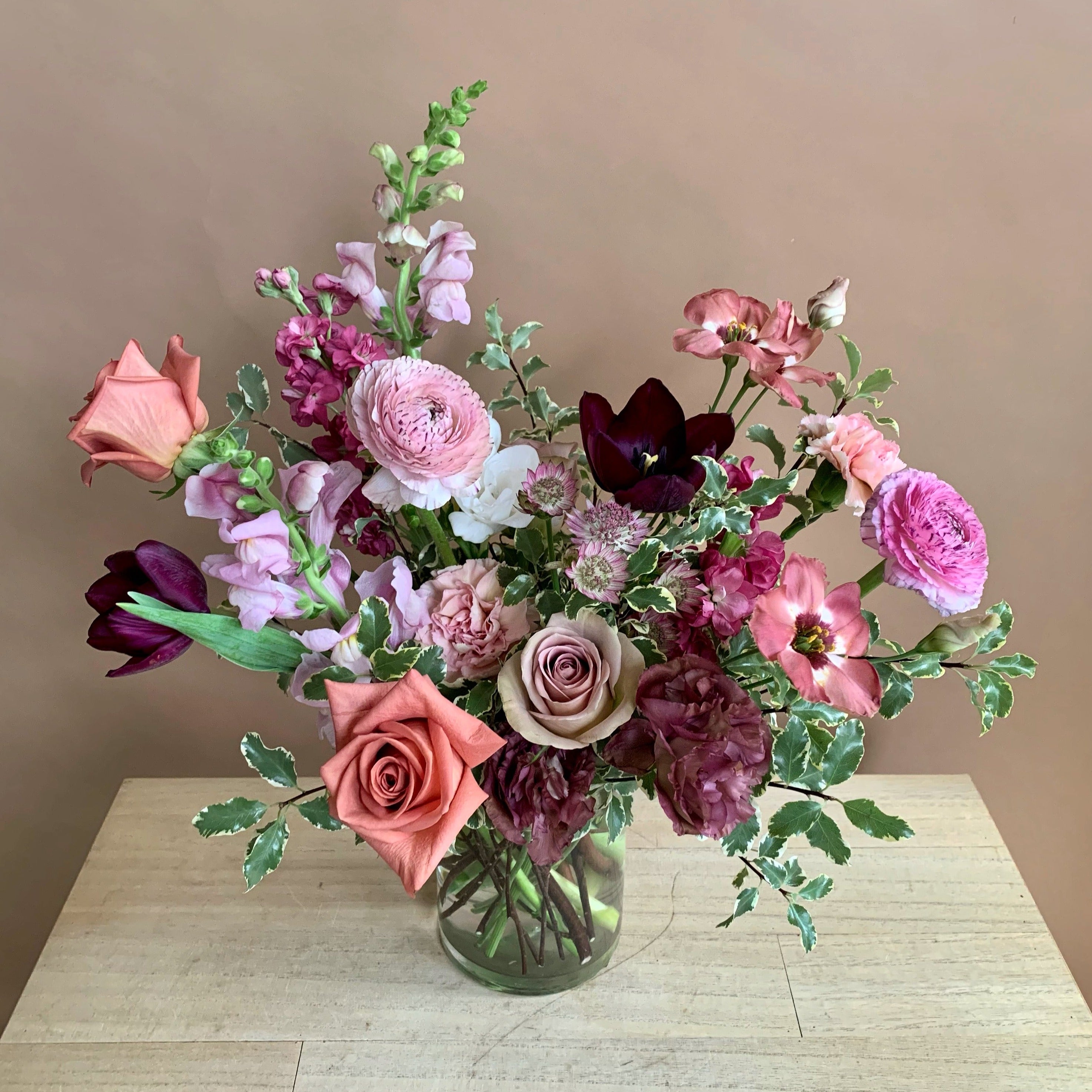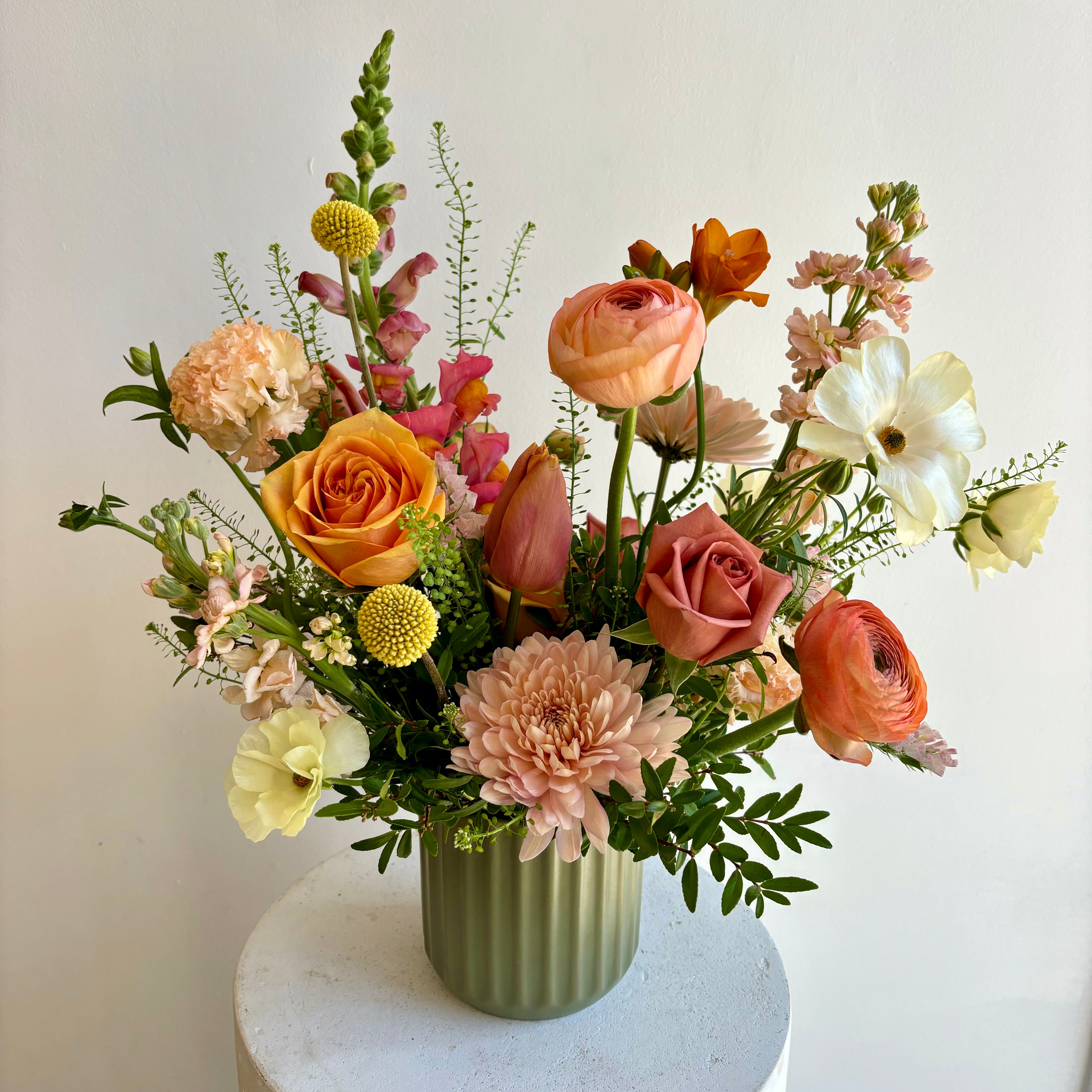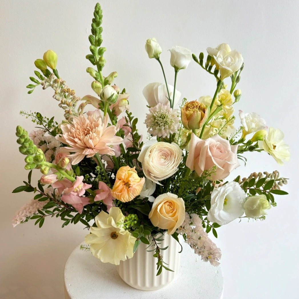 *Exact colours and varieties of flowers used will vary and are based on season and availability. Each arrangement is custom made and the arrangement will not be identical to the one pictured. Our designs are always made without the use of toxic floral foam.*