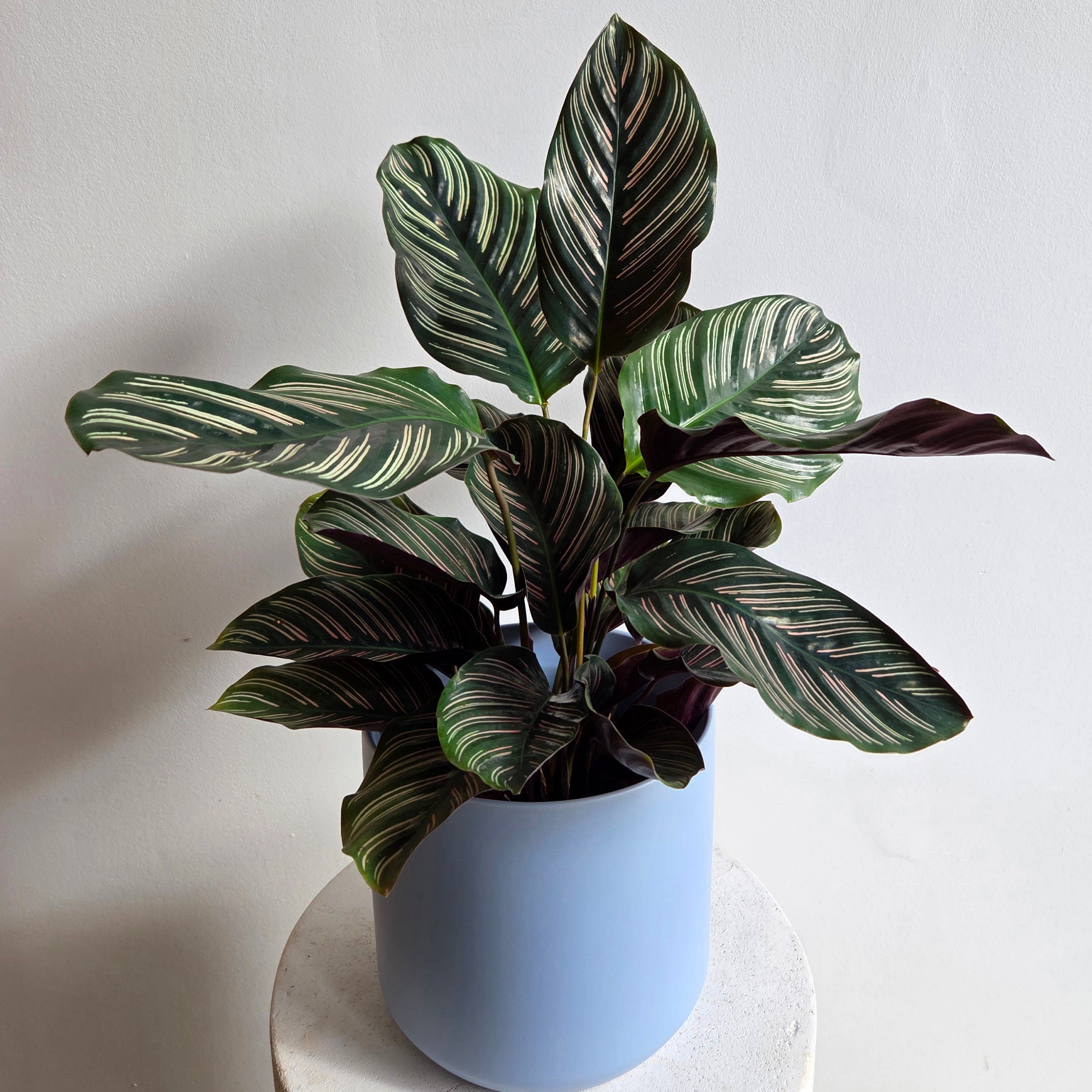 Water every 1-2 weeks, allowing soil to dry out half way down between waterings. Expect to water more often in brighter light and less often in lower light. Calathea varieties tend to do better with distilled water and can be sensitive to unfiltered tap water. Drain well after watering.