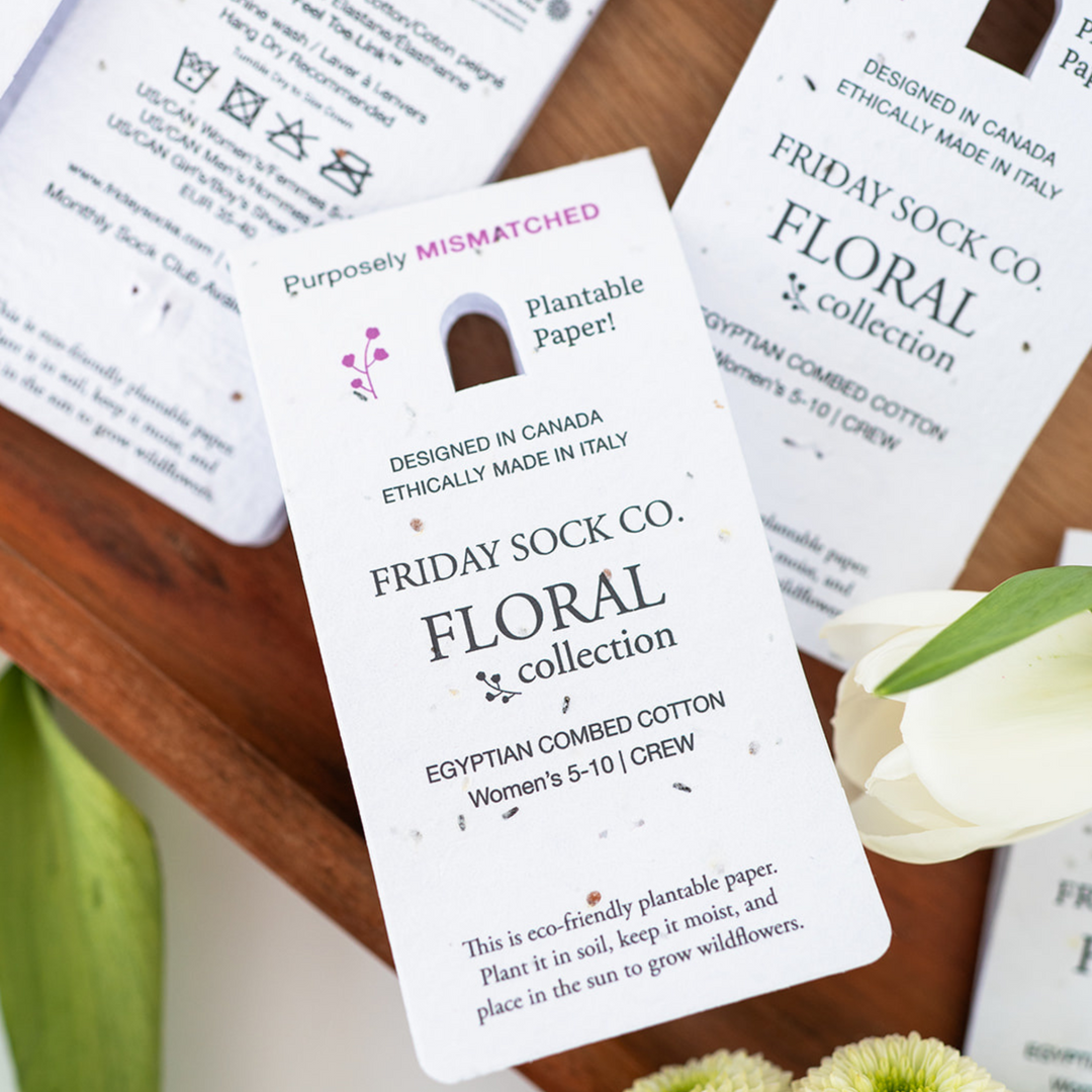 Friday Sock Co. new floral collection features eco-friendly plantable paper hang tags! Plant it in soil, keep it moist, and place in the sun to grow wildflowers.