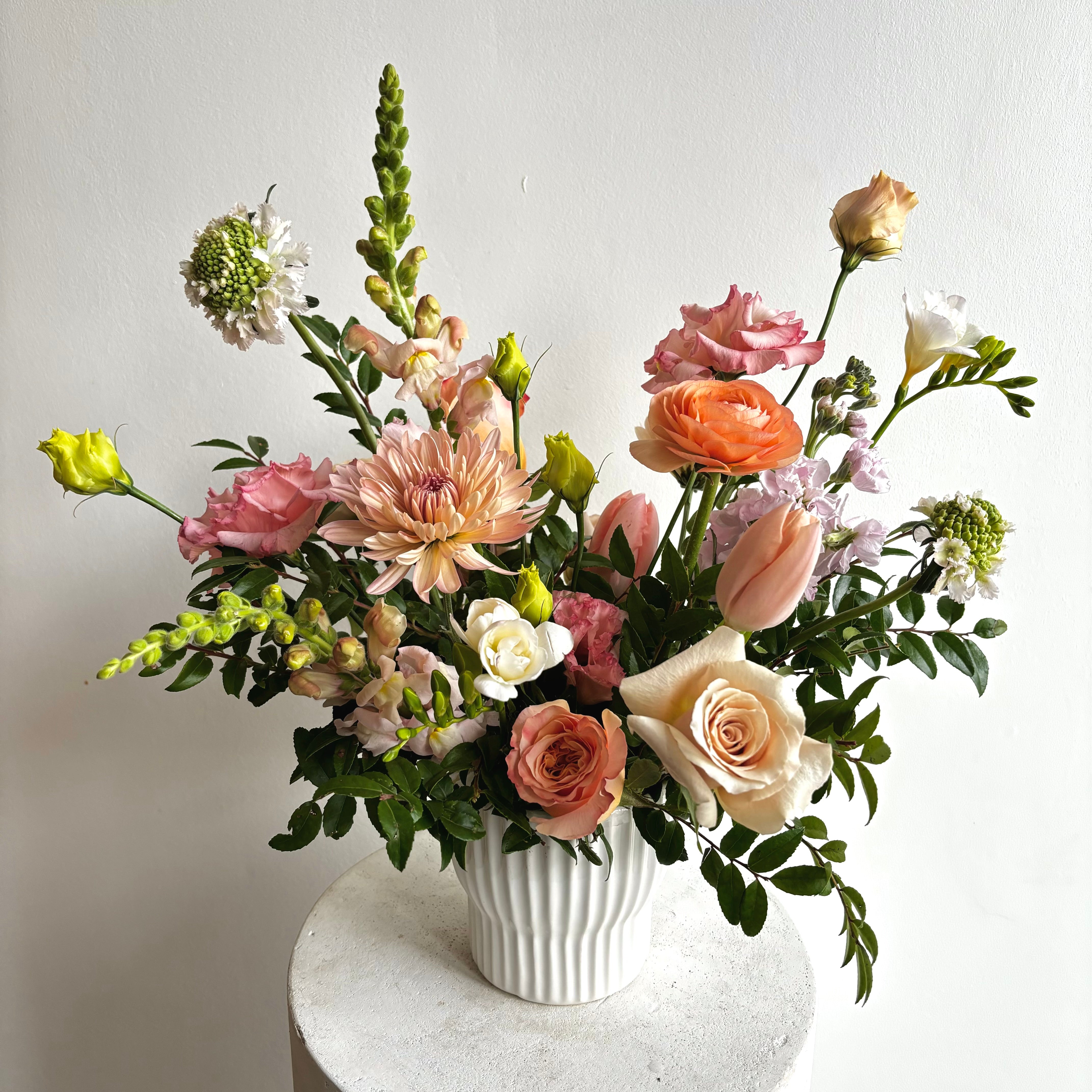 Show your love with one of our signature style flower arrangements in a simple reusable vase. Each delicate bloom is purposefully placed creating an airy and whimsical design using a mix of seasonal flowers in two curated colour palettes. Exact colours and flower varieties may vary slightly. 'The Signature' in 'Berry into You' and 'The Classic' in 'ILY to Peaches' are pictured.