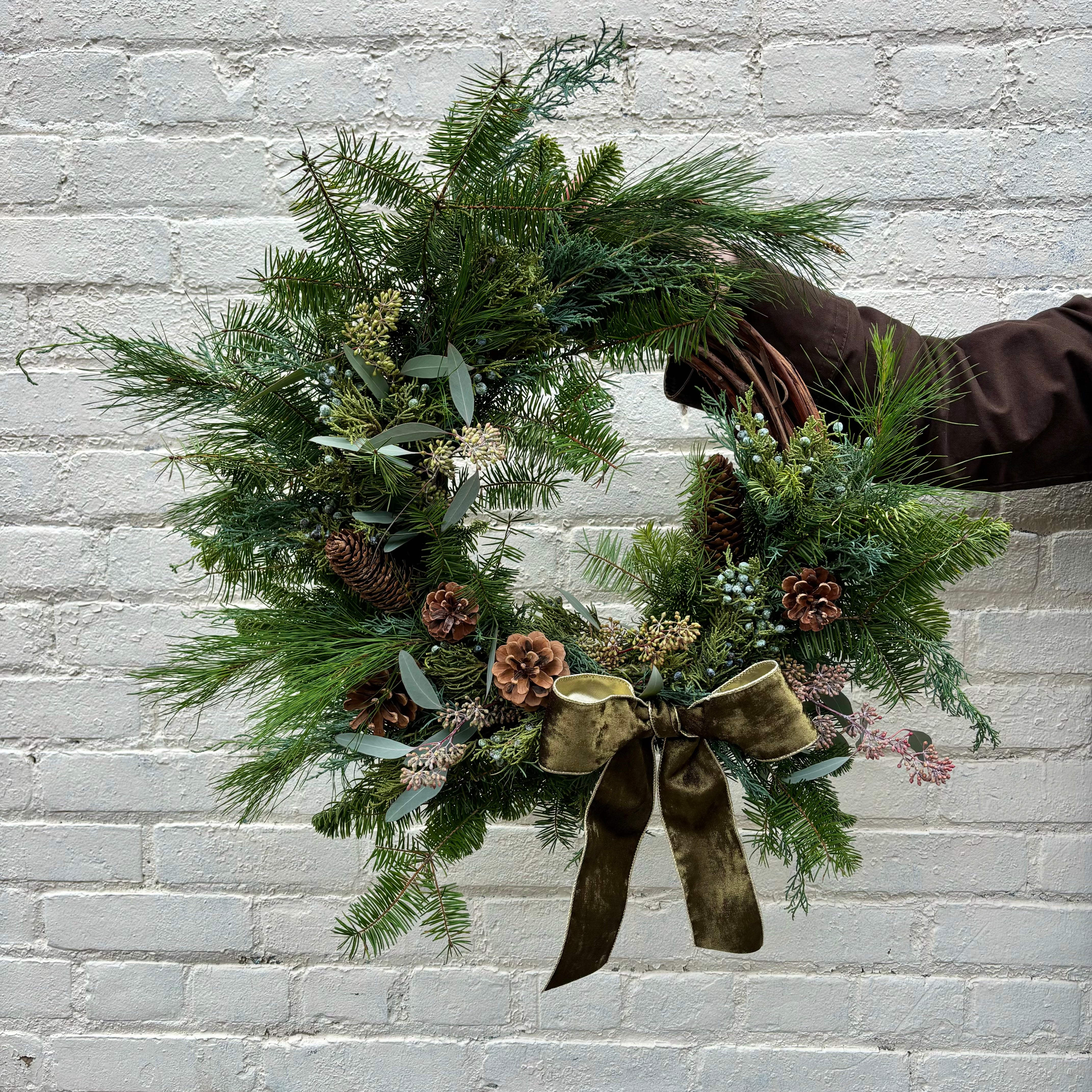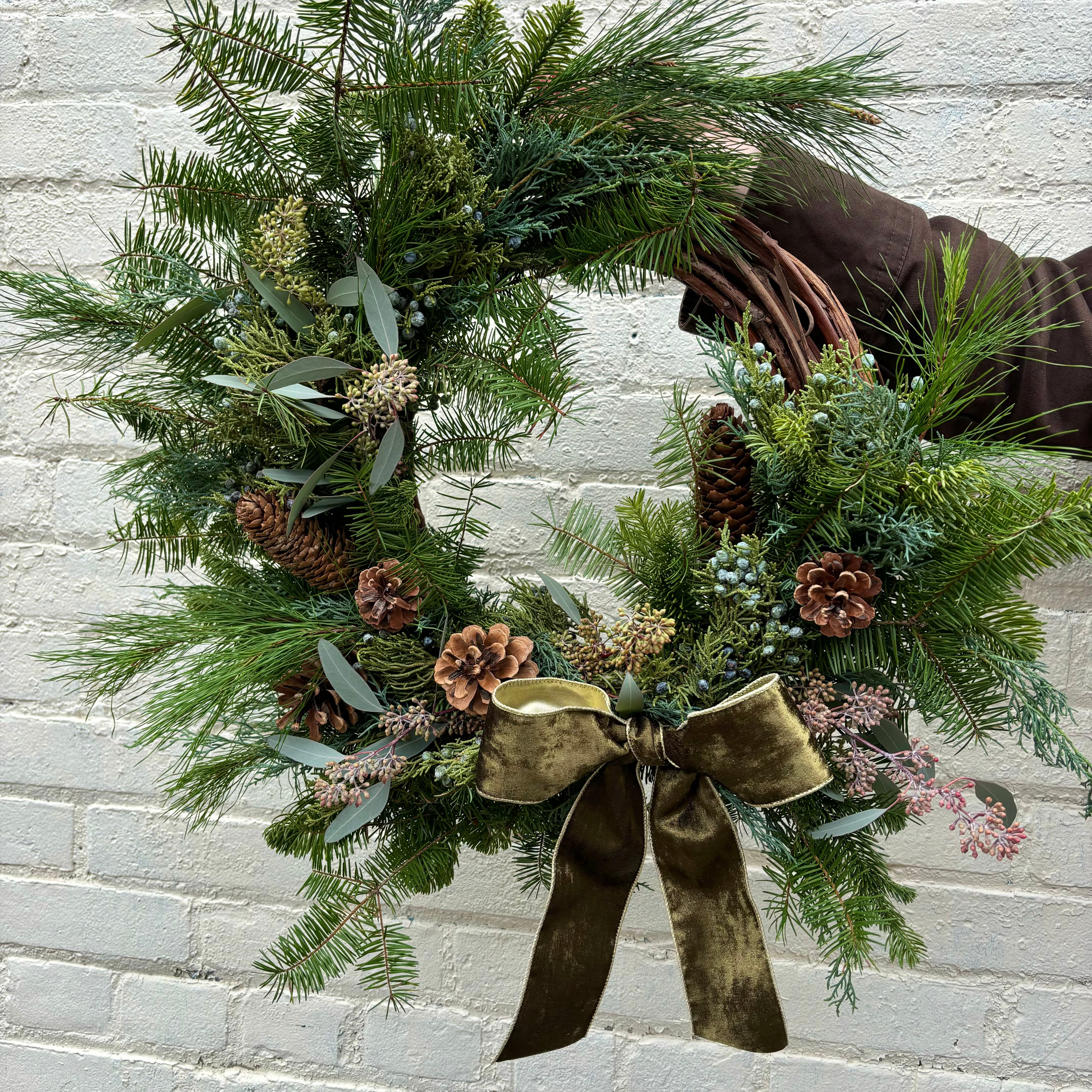 NEW A whimsical take on the classic wreath with exposed grapevine, asymmetrical evergreen coverage, woodsy winter elements including pinecones and seeded eucalyptus and an elegant moss green velvet bow. Our fresh winter wreaths are wild and lush using a mix of evergreens and natural woodsy embellishments on a 14" grapevine base.
